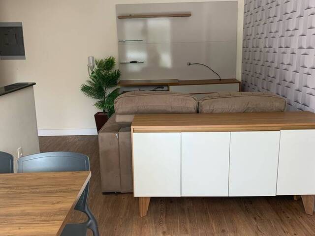 Varanda gourmet com churrasqueira fechada com vidro, 2 dormitórios sendo 1 suíte (ambos com cama e guarda roupa), sala dois ambientes (com conj. de mesa e sofá), cozinha com armários, forno e exaustor e 1 vaga.